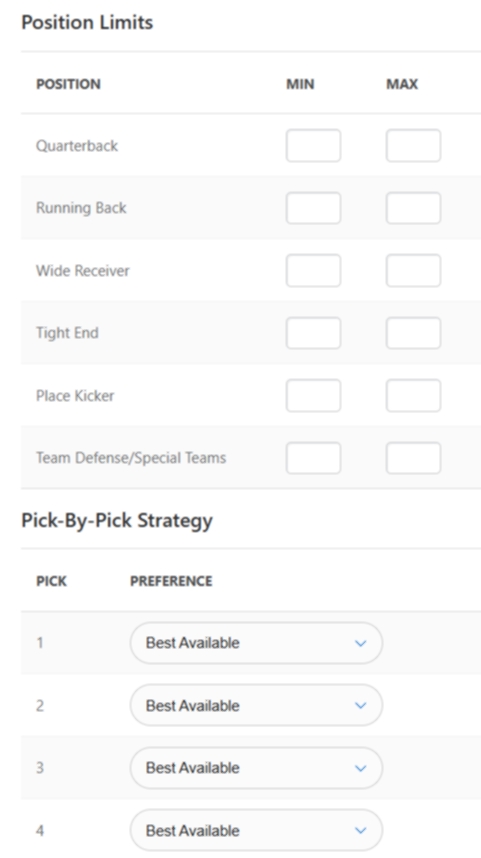 This is where you set the Minimum and Maximum number of players you want at each position. That’s the Postition Limits section. This is also where you direct how you want autopick to prioritize each pick. That’s the Pick-By-Pick strategy.